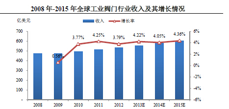 從中長期來看,影響閥門行業(yè)的下游行業(yè)擴張的主要因素,包括不斷增長的能源需求、全球人口的持續(xù)增加以及發(fā)展中國家的城市化、工業(yè)化進(jìn)程并沒有因金融危機而發(fā)生根本性改變。目前全球各主要經(jīng)濟體都已經(jīng)進(jìn)入經(jīng)濟復(fù)蘇周期(根據(jù)國際貨幣基金組織的統(tǒng)計和預(yù)測數(shù)據(jù),2010年、2011年和2012年全球經(jīng)濟增長實現(xiàn)恢復(fù)性增長,增長率分別為5.3%、3.9%和3.2%,2013年和2014年全球經(jīng)濟年增長速度預(yù)計為2.9%和3.6%)。閥門行業(yè)自2010年也開始走向復(fù)蘇,根據(jù)McIlvaine的調(diào)查和預(yù)測數(shù)據(jù),2010年、2011年和2012年,全球工業(yè)閥門行業(yè)收入分別為492.24億美元、513.17億美元和532.61億美元,增長率恢復(fù)至3.77%、4.25%和3.79%,2013年-2015年全球工業(yè)閥門行業(yè)的預(yù)計銷售增長率將分別達(dá)到4.22%、4.05%和4.36%,呈現(xiàn)穩(wěn)步上升的增長態(tài)勢。