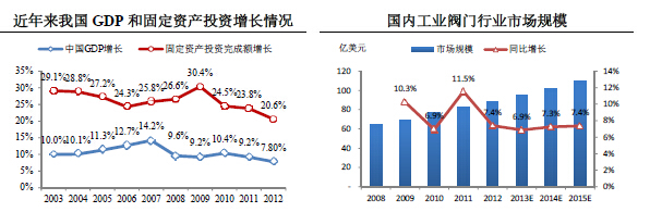 2003年-2012年,中國經(jīng)濟總體上保持快速增長的發(fā)展態(tài)勢,平均GDP增長率為10.45%,全社會固定資產(chǎn)投資完成額增長率平均為26.11%。國內(nèi)閥門行業(yè)整體上保持持續(xù)增長的態(tài)勢,景氣程度高于全球水平。2008年全球金融危機爆發(fā)后,國內(nèi)閥門行業(yè)增速下滑,但在2010年又恢復(fù)到較高的增長水平。根據(jù)McIlvaine的分析,預(yù)計2013年至2015年,中國工業(yè)閥門行業(yè)市場規(guī)模的增長率還將穩(wěn)定在7%左右,遠(yuǎn)高于全球的工業(yè)閥門行業(yè)增長速度。